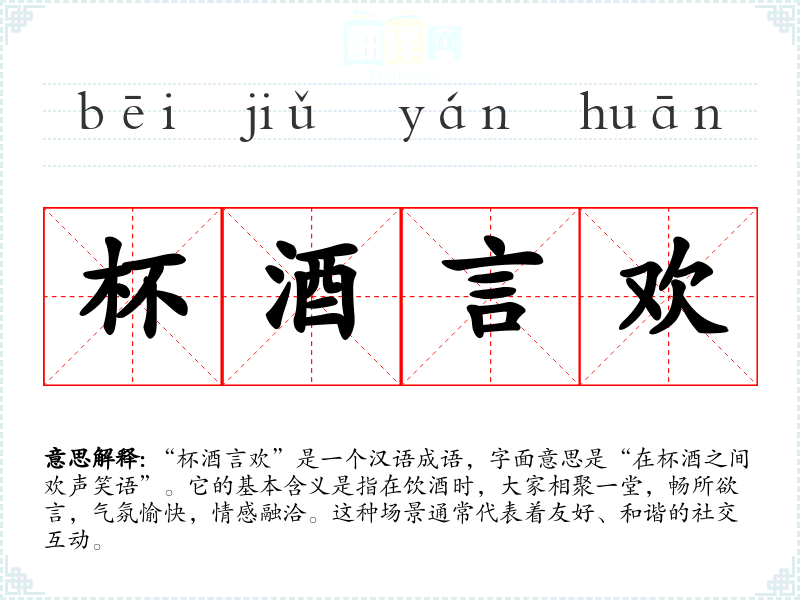 “杯酒言欢”是一个汉语成语,字面意思是“在杯酒之间欢声笑语”。它的基本含义是指在饮酒时,大家相聚一堂,畅所欲言,气氛愉快,情感融洽。这种场景通常代表着友好、和谐的社交互动。
