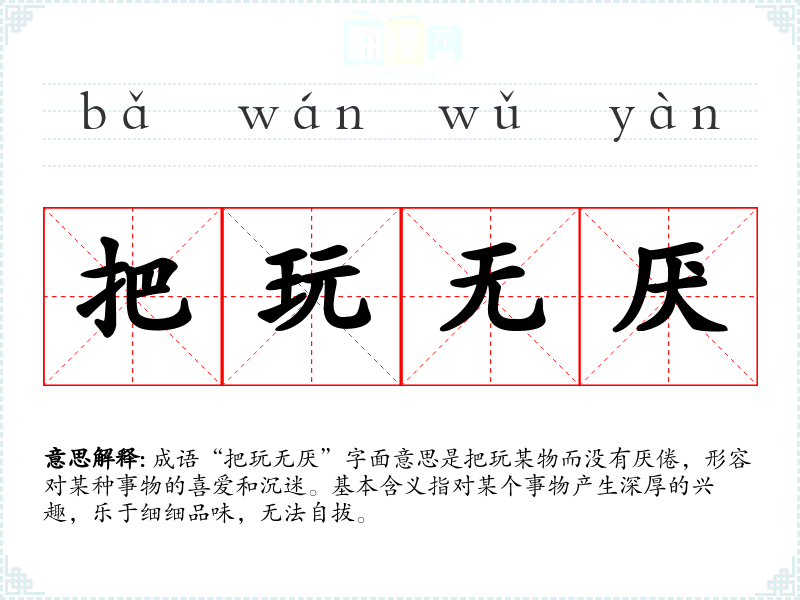 成语“把玩无厌”字面意思是把玩某物而没有厌倦,形容对某种事物的喜爱和沉迷。基本含义指对某个事物产生深厚的兴趣,乐于细细品味,无法自拔。