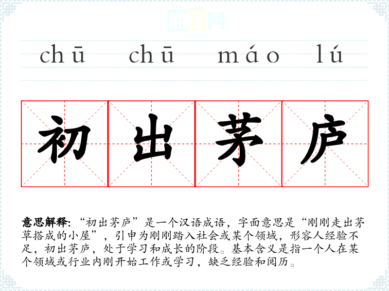 “初出茅庐”是一个汉语成语,字面意思是“刚刚走出茅草搭成的小屋”,引申为刚刚踏入社会或某个领域,形容人经验不足,初出茅庐,处于学习和成长的阶段。基本含义是指一个人在某个领域或行业内刚开始工作或学习,缺乏经验和阅历。