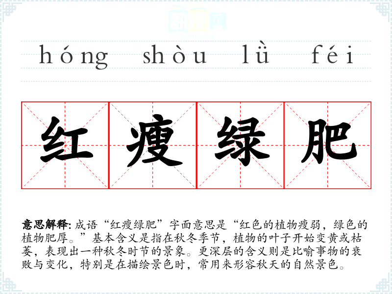 - 文学作品:在描写秋天景色时,可以用“红瘦绿肥”来形象地表达景色的变化。