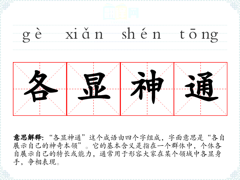 “各显神通”这个成语由四个字组成,字面意思是“各自展示自己的神奇本领”。它的基本含义是指在一个群体中,个体各自展示自己的特长或能力,通常用于形容大家在某个领域中各显身手,争相表现。