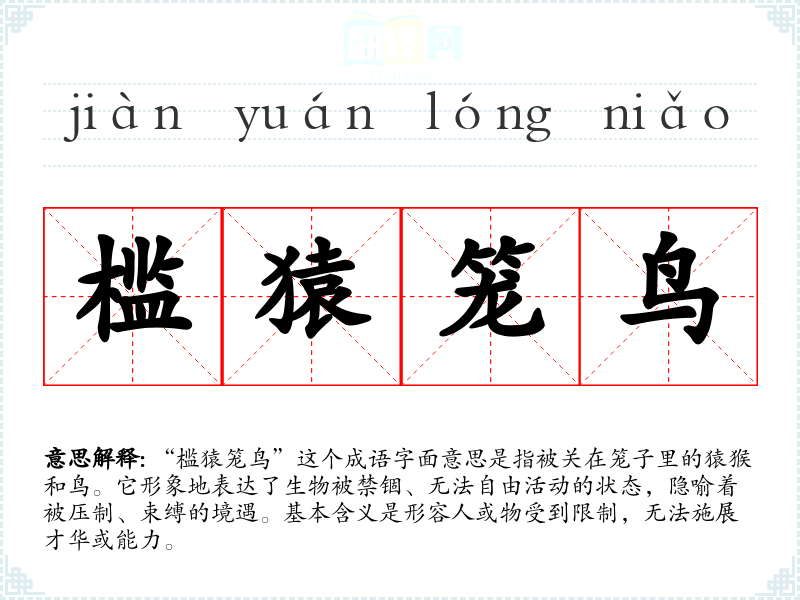 “槛猿笼鸟”这个成语字面意思是指被关在笼子里的猿猴和鸟。它形象地表达了生物被禁锢、无法自由活动的状态,隐喻着被压制、束缚的境遇。基本含义是形容人或物受到限制,无法施展才华或能力。