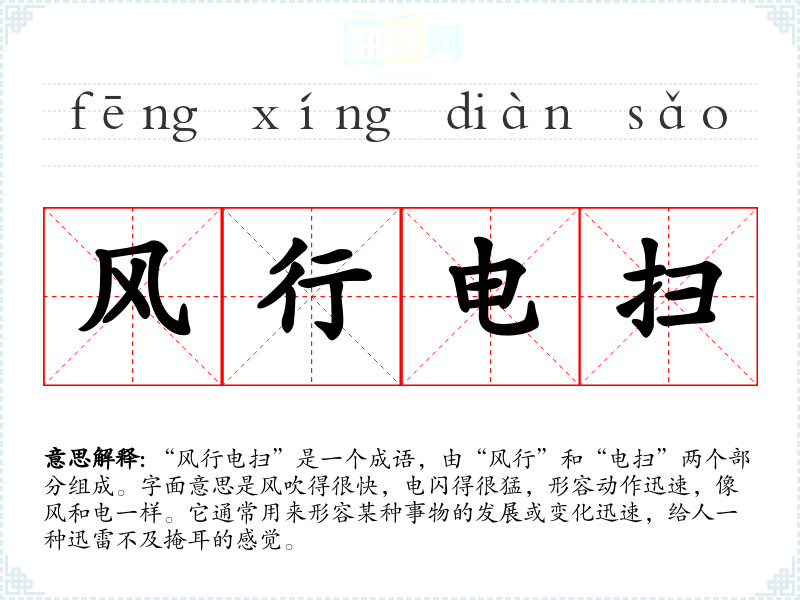 “风行电扫”是一个成语,由“风行”和“电扫”两个部分组成。字面意思是风吹得很快,电闪得很猛,形容动作迅速,像风和电一样。它通常用来形容某种事物的发展或变化迅速,给人一种迅雷不及掩耳的感觉。