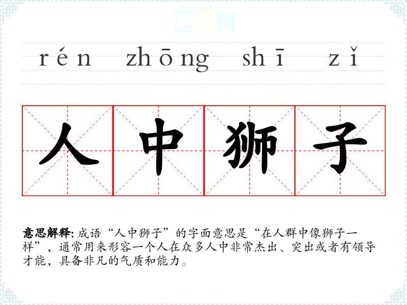 成语“人中狮子”的字面意思是“在人群中像狮子一样”,通常用来形容一个人在众多人中非常杰出、突出或者有领导才能,具备非凡的气质和能力。