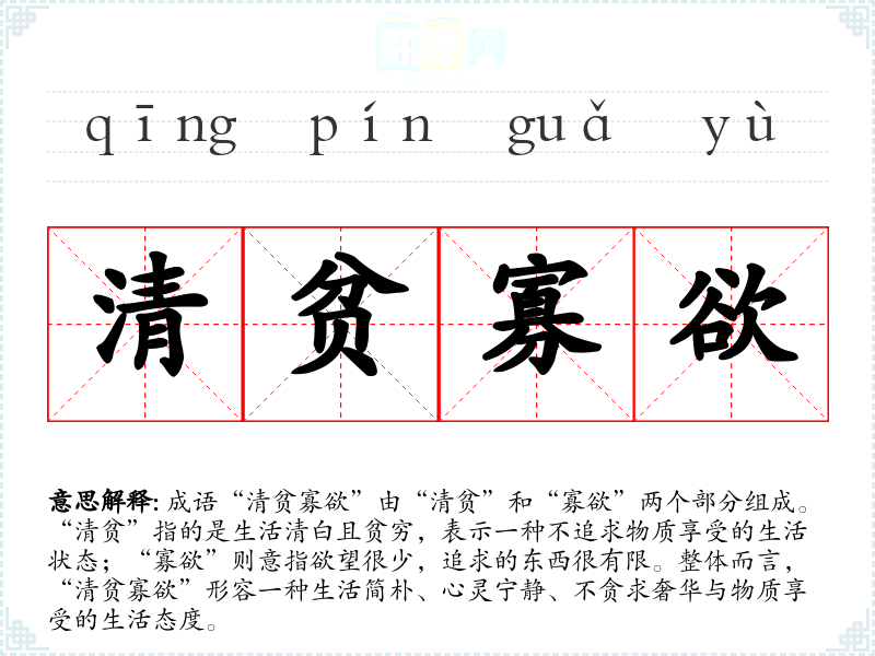 成语“清贫寡欲”由“清贫”和“寡欲”两个部分组成。“清贫”指的是生活清白且贫穷,表示一种不追求物质享受的生活状态;“寡欲”则意指欲望很少,追求的东西很有限。整体而言,“清贫寡欲”形容一种生活简朴、心灵宁静、不贪求奢华与物质享受的生活态度。