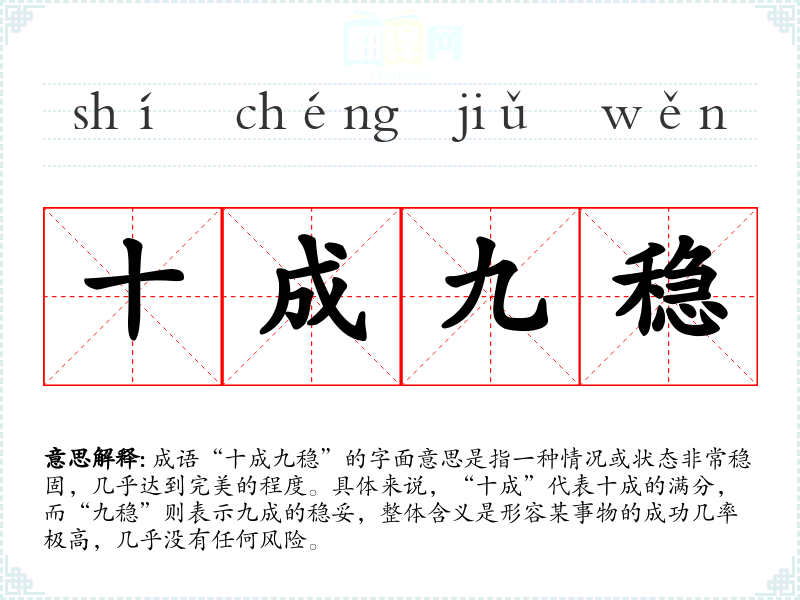 成语“十成九稳”的字面意思是指一种情况或状态非常稳固,几乎达到完美的程度。具体来说,“十成”代表十成的满分,而“九稳”则表示九成的稳妥,整体含义是形容某事物的成功几率极高,几乎没有任何风险。