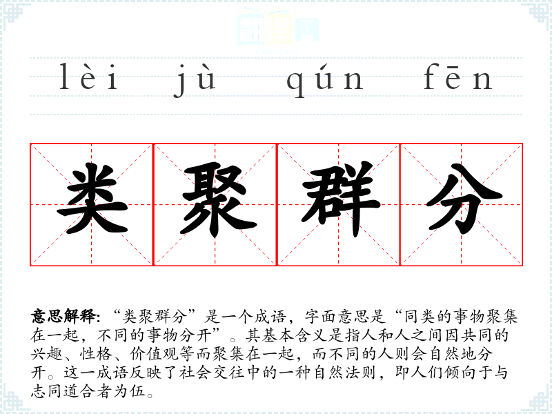 “类聚群分”是一个成语,字面意思是“同类的事物聚集在一起,不同的事物分开”。其基本含义是指人和人之间因共同的兴趣、性格、价值观等而聚集在一起,而不同的人则会自然地分开。这一成语反映了社会交往中的一种自然法则,即人们倾向于与志同道合者为伍。