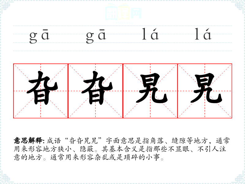 成语“旮旮旯旯”字面意思是指角落、缝隙等地方,通常用来形容地方狭小、隐蔽。其基本含义是指那些不显眼、不引人注意的地方。通常用来形容杂乱或是琐碎的小事。