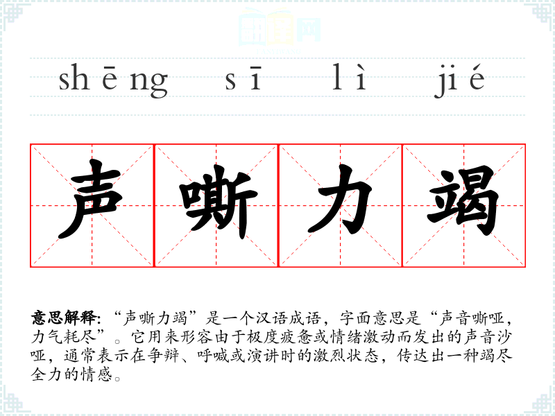 “声嘶力竭”是一个汉语成语,字面意思是“声音嘶哑,力气耗尽”。它用来形容由于极度疲惫或情绪激动而发出的声音沙哑,通常表示在争辩、呼喊或演讲时的激烈状态,传达出一种竭尽全力的情感。