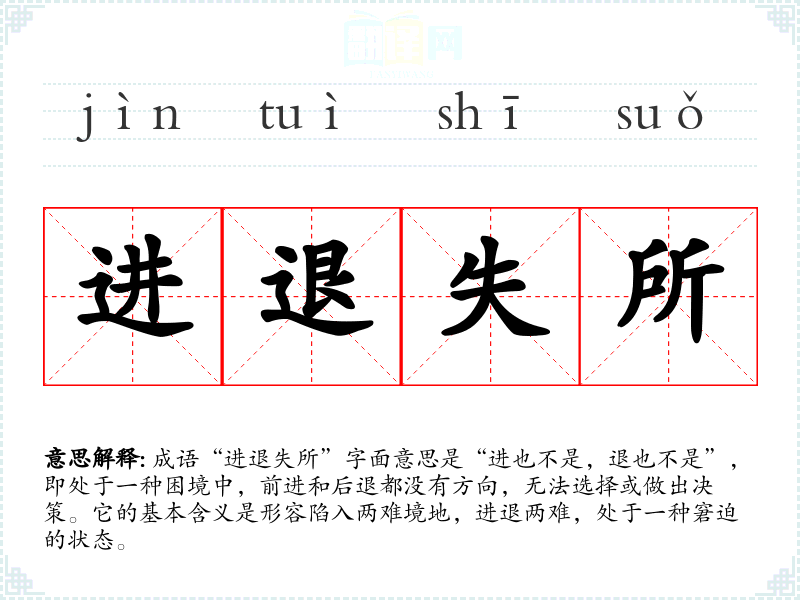 成语“进退失所”字面意思是“进也不是,退也不是”,即处于一种困境中,前进和后退都没有方向,无法选择或做出决策。它的基本含义是形容陷入两难境地,进退两难,处于一种窘迫的状态。