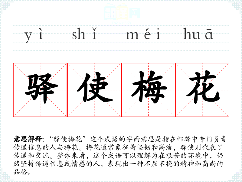 “驿使梅花”这个成语的字面意思是指在邮驿中专门负责传递信息的人与梅花。梅花通常象征着坚韧和高洁,驿使则代表了传递和交流。整体来看,这个成语可以理解为在艰苦的环境中,仍然坚持传递信息或情感的人,表现出一种不屈不挠的精神和高尚的品格。