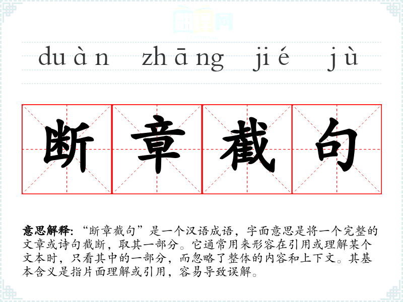 “断章截句”是一个汉语成语,字面意思是将一个完整的文章或诗句截断,取其一部分。它通常用来形容在引用或理解某个文本时,只看其中的一部分,而忽略了整体的内容和上下文。其基本含义是指片面理解或引用,容易导致误解。