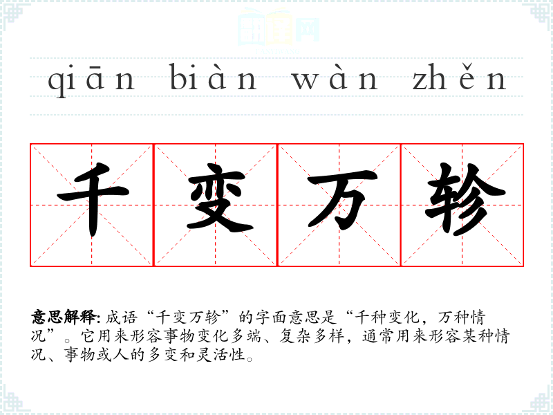成语“千变万轸”的字面意思是“千种变化,万种情况”。它用来形容事物变化多端、复杂多样,通常用来形容某种情况、事物或人的多变和灵活性。