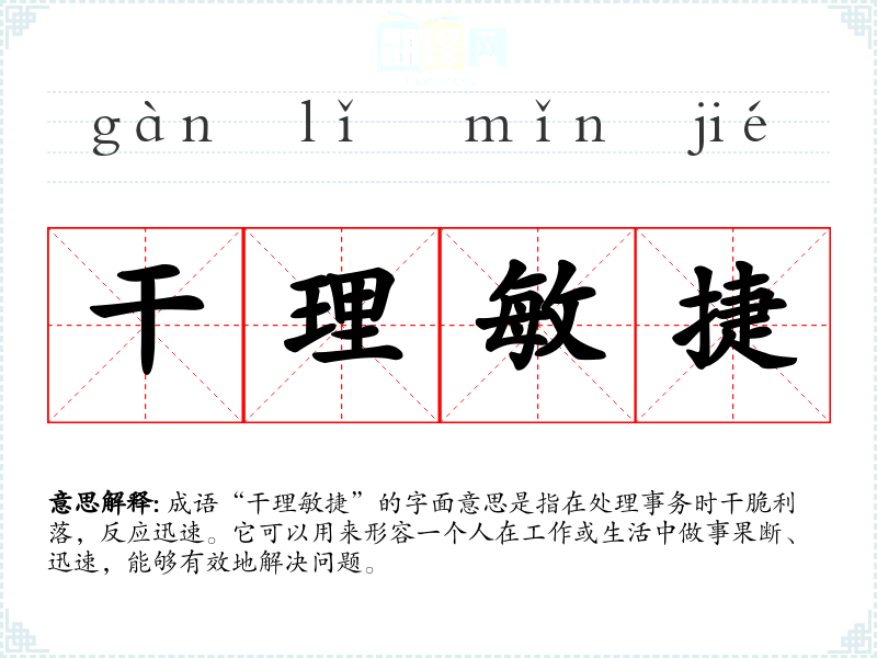 成语“干理敏捷”的字面意思是指在处理事务时干脆利落,反应迅速。它可以用来形容一个人在工作或生活中做事果断、迅速,能够有效地解决问题。