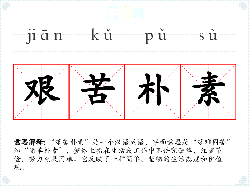 “艰苦朴素”是一个汉语成语,字面意思是“艰难困苦”和“简单朴素”,整体上指在生活或工作中不讲究奢华,注重节俭,努力克服困难。它反映了一种简单、坚韧的生活态度和价值观。