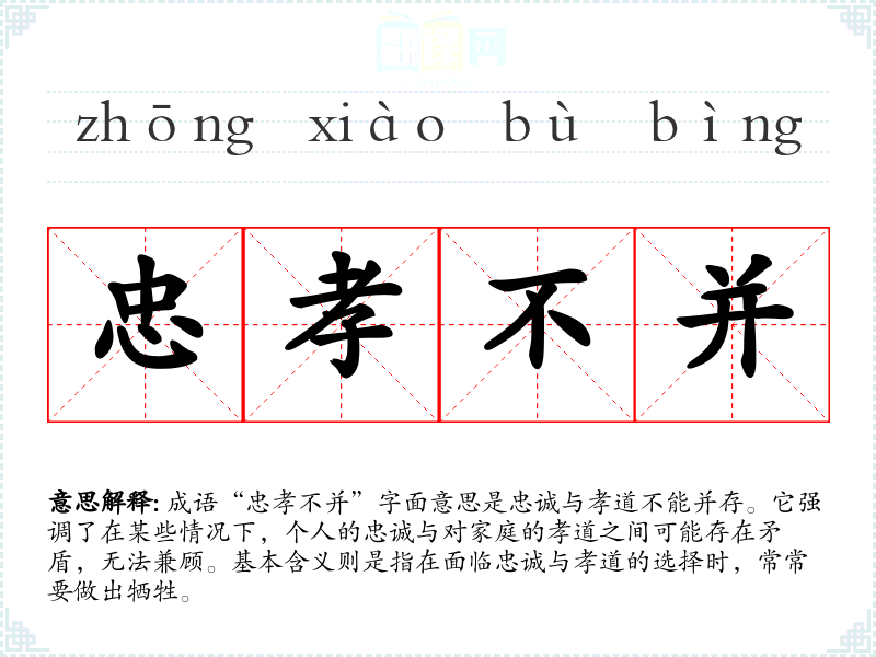 该成语的历史背景主要源于**传统文化中的忠与孝观念。忠是指对国家、君主或团体的忠诚,而孝则是对父母、长辈的尊敬和照顾。古代社会重视这两者,但在某些情况下,这两者可能会发生冲突,因此形成了“忠孝不并”的说法。