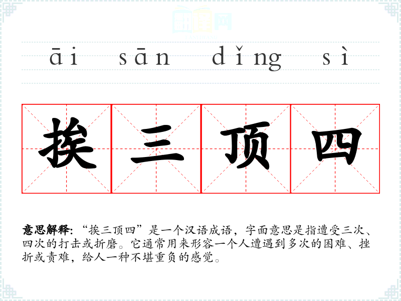 “挨三顶四”是一个汉语成语,字面意思是指遭受三次、四次的打击或折磨。它通常用来形容一个人遭遇到多次的困难、挫折或责难,给人一种不堪重负的感觉。