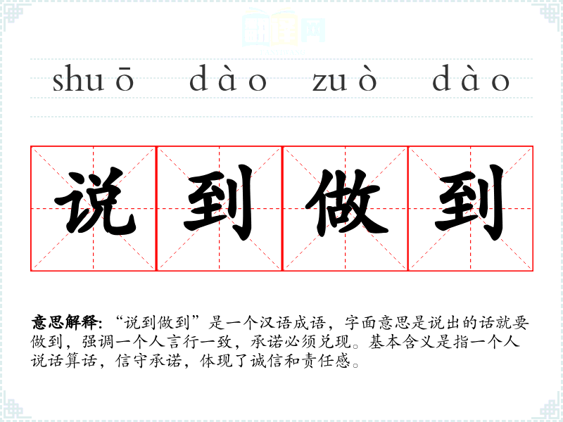 “说到做到”是一个汉语成语,字面意思是说出的话就要做到,强调一个人言行一致,承诺必须兑现。基本含义是指一个人说话算话,信守承诺,体现了诚信和责任感。