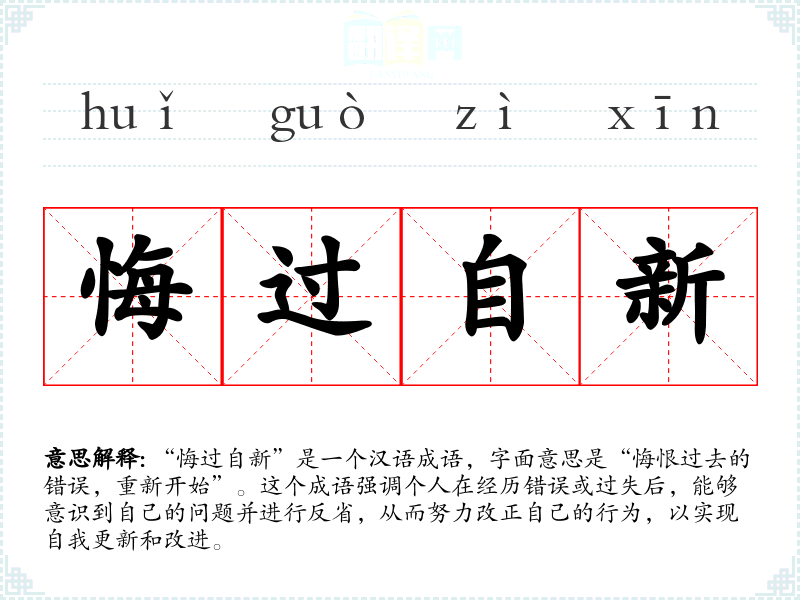“悔过自新”是一个汉语成语,字面意思是“悔恨过去的错误,重新开始”。这个成语强调个人在经历错误或过失后,能够意识到自己的问题并进行反省,从而努力改正自己的行为,以实现自我更新和改进。