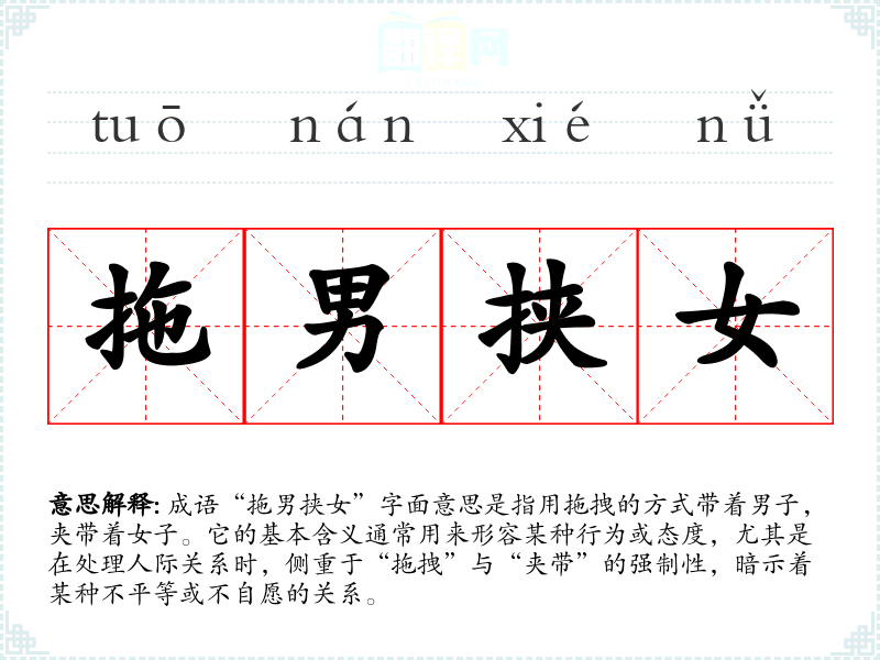 成语“拖男挟女”字面意思是指用拖拽的方式带着男子,夹带着女子。它的基本含义通常用来形容某种行为或态度,尤其是在处理人际关系时,侧重于“拖拽”与“夹带”的强制性,暗示着某种不平等或不自愿的关系。