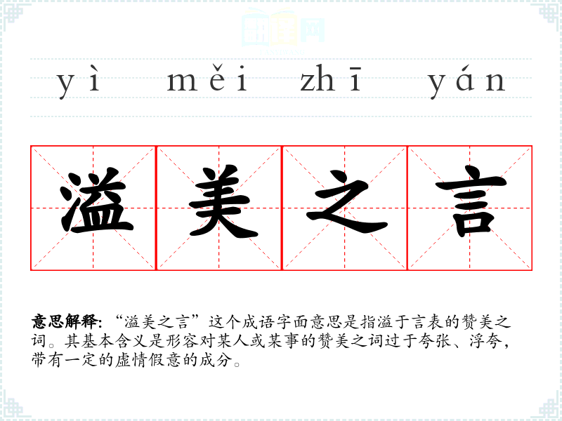 “溢美之言”这个成语字面意思是指溢于言表的赞美之词。其基本含义是形容对某人或某事的赞美之词过于夸张、浮夸,带有一定的虚情假意的成分。