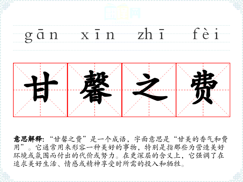 “甘馨之费”是一个成语,字面意思是“甘美的香气和费用”。它通常用来形容一种美好的事物,特别是指那些为营造美好环境或氛围而付出的代价或努力。在更深层的含义上,它强调了在追求美好生活、情感或精神享受时所需的投入和牺牲。