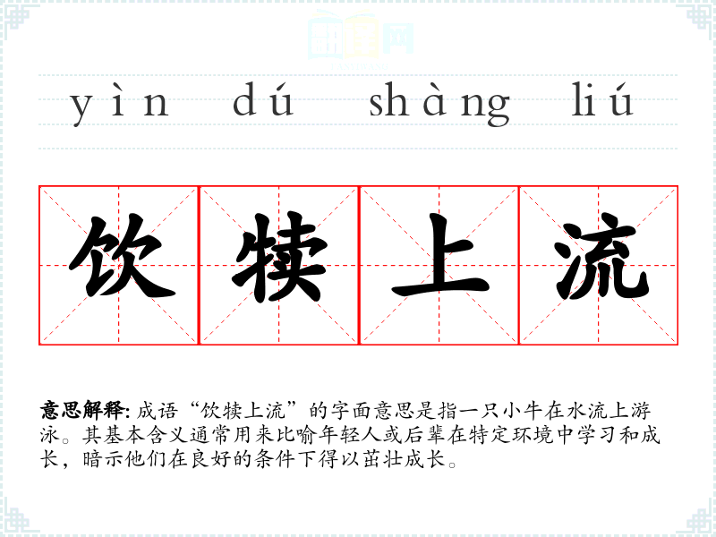 成语“饮犊上流”的字面意思是指一只小牛在水流上游泳。其基本含义通常用来比喻年轻人或后辈在特定环境中学*和成长,暗示他们在良好的条件下得以茁壮成长。