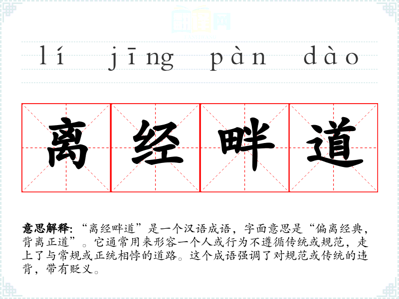 | 畔道离经 | 畔:通“叛”,违背。违背道德,脱离经典。指背离常规的思想或行为。 |