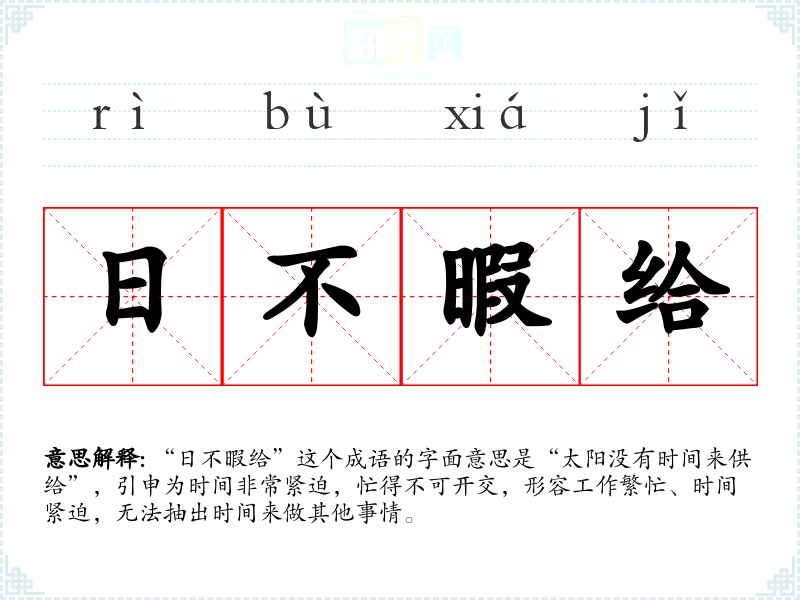 “日不暇给”这个成语的字面意思是“太阳没有时间来供给”,引申为时间非常紧迫,忙得不可开交,形容工作繁忙、时间紧迫,无法抽出时间来做其他事情。