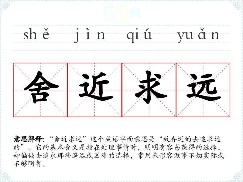 “舍近求远”这个成语字面意思是“放弃近的去追求远的”。它的基本含义是指在处理事情时,明明有容易获得的选择,却偏偏去追求那些遥远或困难的选择,常用来形容做事不切实际或不够明智。