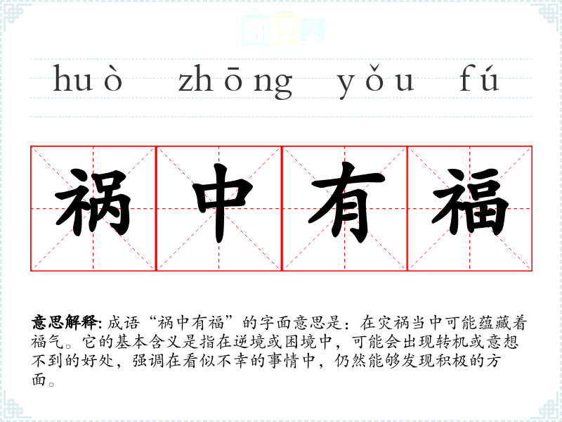 成语“祸中有福”的字面意思是:在灾祸当中可能蕴藏着福气。它的基本含义是指在逆境或困境中,可能会出现转机或意想不到的好处,强调在看似不幸的事情中,仍然能够发现积极的方面。