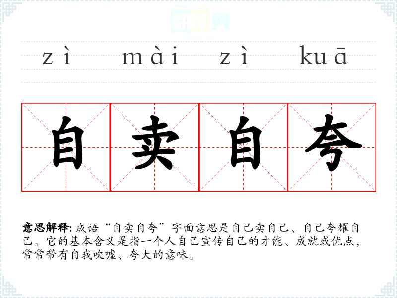 成语“自卖自夸”字面意思是自己卖自己、自己夸耀自己。它的基本含义是指一个人自己宣传自己的才能、成就或优点,常常带有自我吹嘘、夸大的意味。