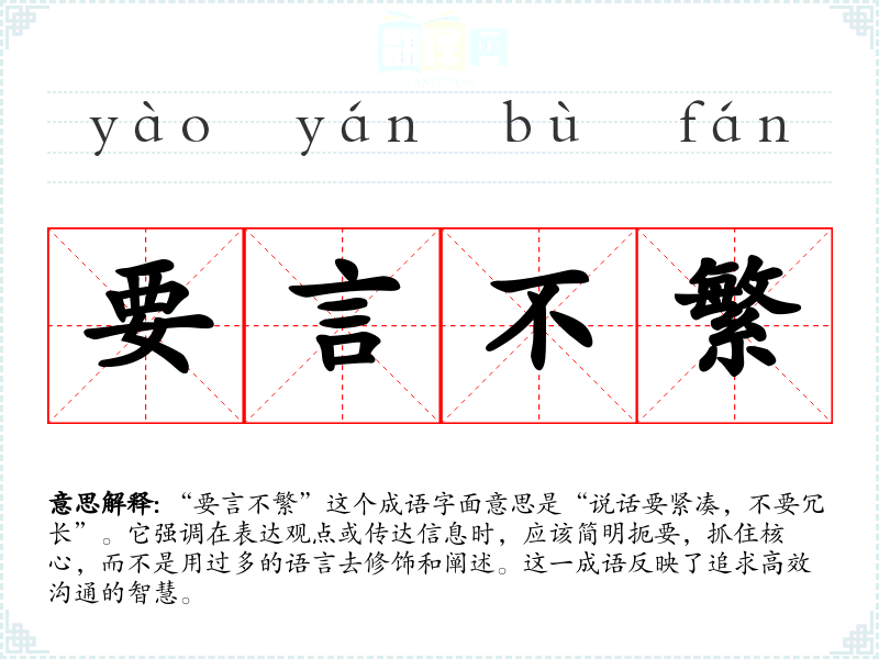 “要言不繁”这个成语字面意思是“说话要紧凑,不要冗长”。它强调在表达观点或传达信息时,应该简明扼要,抓住核心,而不是用过多的语言去修饰和阐述。这一成语反映了追求高效沟通的智慧。