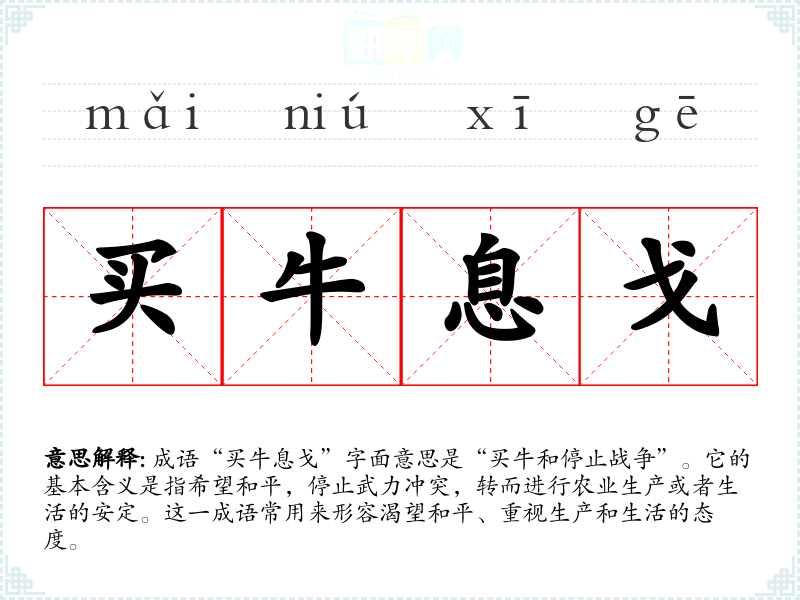 成语“买牛息戈”字面意思是“买牛和停止战争”。它的基本含义是指希望和平,停止武力冲突,转而进行农业生产或者生活的安定。这一成语常用来形容渴望和平、重视生产和生活的态度。