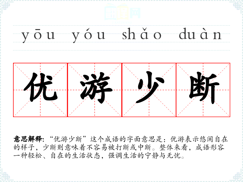 “优游少断”这个成语的字面意思是:优游表示悠闲自在的样子,少断则意味着不容易被打断或中断。整体来看,成语形容一种轻松、自在的生活状态,强调生活的宁静与无忧。