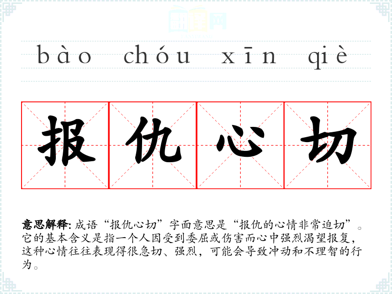 成语“报仇心切”字面意思是“报仇的心情非常迫切”。它的基本含义是指一个人因受到委屈或伤害而心中强烈渴望报复,这种心情往往表现得很急切、强烈,可能会导致冲动和不理智的行为。