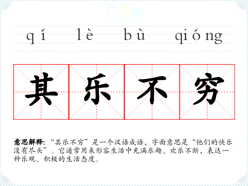 “其乐不穷”是一个汉语成语,字面意思是“他们的快乐没有尽头”。它通常用来形容生活中充满乐趣、欢乐不断,表达一种乐观、积极的生活态度。