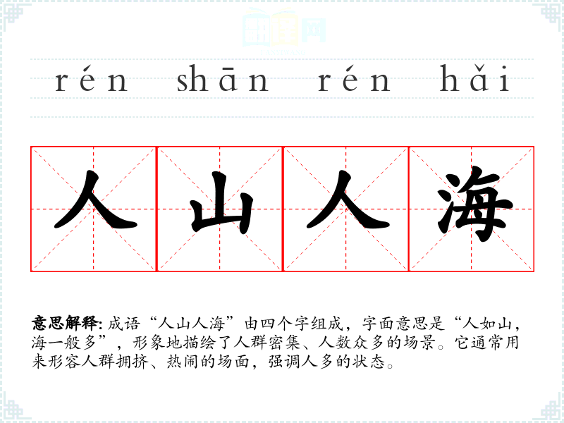 成语“人山人海”由四个字组成,字面意思是“人如山,海一般多”,形象地描绘了人群密集、人数众多的场景。它通常用来形容人群拥挤、热闹的场面,强调人多的状态。