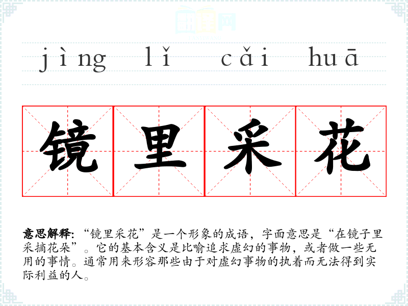 “镜里采花”是一个形象的成语,字面意思是“在镜子里采摘花朵”。它的基本含义是比喻追求虚幻的事物,或者做一些无用的事情。通常用来形容那些由于对虚幻事物的执着而无法得到实际利益的人。