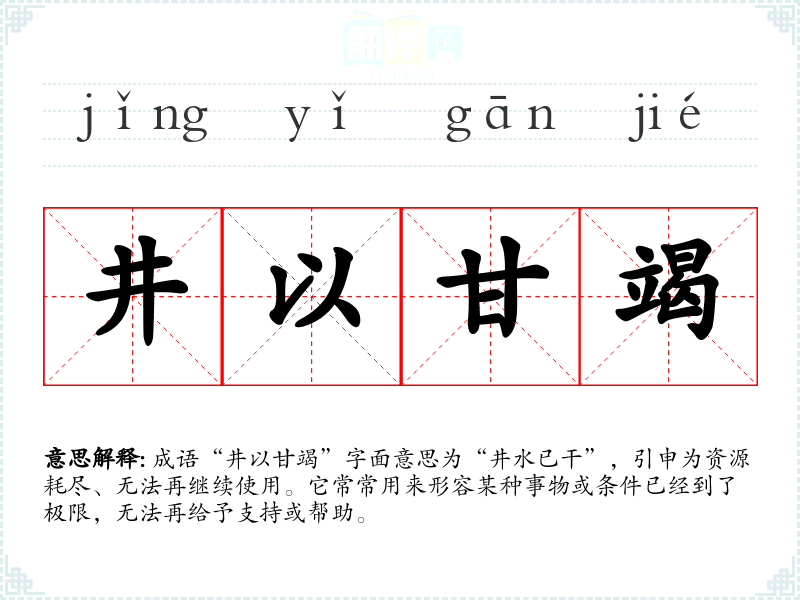 成语“井以甘竭”字面意思为“井水已干”,引申为资源耗尽、无法再继续使用。它常常用来形容某种事物或条件已经到了极限,无法再给予支持或帮助。