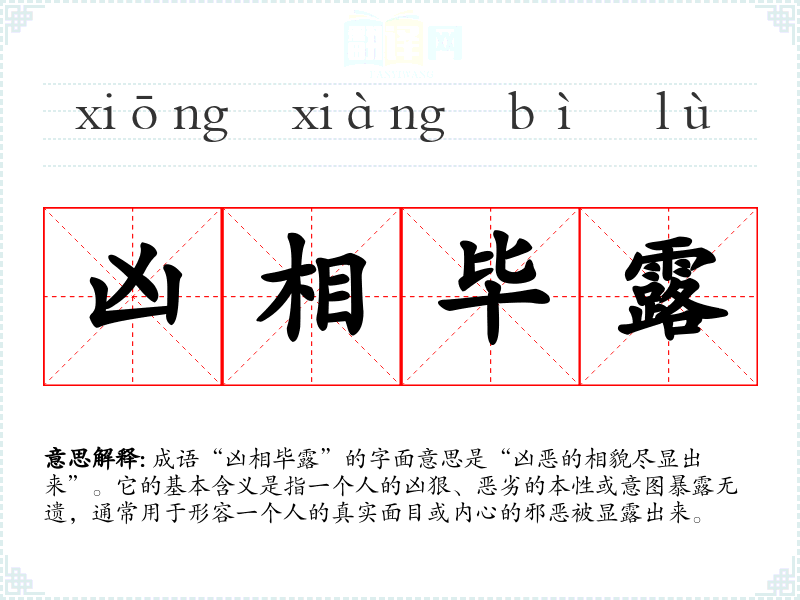 成语“凶相毕露”的字面意思是“凶恶的相貌尽显出来”。它的基本含义是指一个人的凶狠、恶劣的本性或意图暴露无遗,通常用于形容一个人的真实面目或内心的邪恶被显露出来。