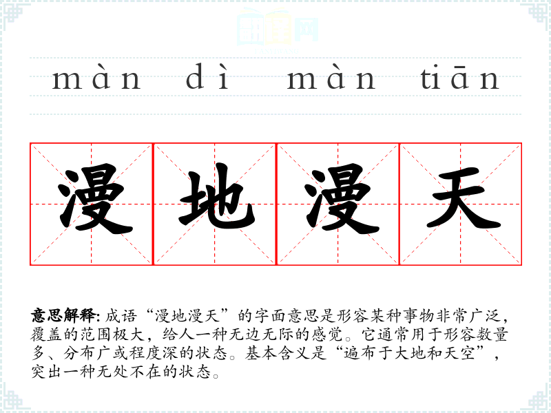 “漫地漫天”并没有明确的历史典故或文学出处,可能是对“漫”这一字的多重用法的结合。成语中的“漫”字有“泛滥”、“铺满”的意思,而“地”和“天”则分别代表了地面与天空,强调了事物的广泛性和无处不在的特征。