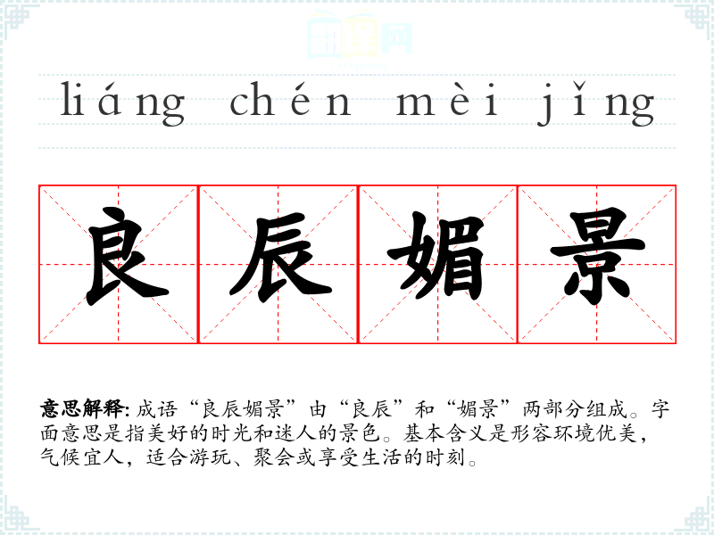 成语“良辰媚景”由“良辰”和“媚景”两部分组成。字面意思是指美好的时光和迷人的景色。基本含义是形容环境优美,气候宜人,适合游玩、聚会或享受生活的时刻。