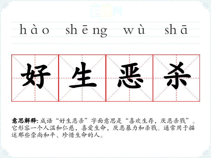 成语“好生恶杀”字面意思是“喜欢生存,厌恶杀戮”。它形容一个人温和仁慈,喜爱生命,厌恶暴力和杀戮。通常用于描述那些崇尚和平、珍惜生命的人。