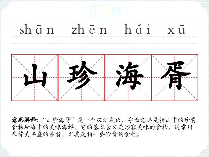 “山珍海胥”是一个汉语成语,字面意思是指山中的珍贵食物和海中的美味海鲜。它的基本含义是形容美味的食物,通常用来赞美丰盛的菜肴,尤其是指一些珍贵的食材。