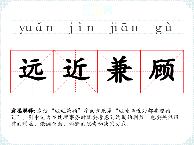成语“远近兼顾”字面意思是“远处与近处都要照顾到”,引申义为在处理事务时既要考虑到远期的利益,也要关注眼前的利益,强调全面、均衡的思考和决策方式。
