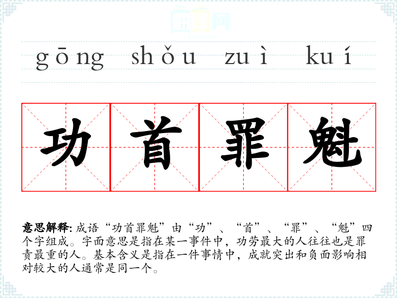 | 功首罪魁 | 功:功绩;首:首先;罪:罪责,罪行;魁:为首的,居第一位的。功绩数最大,罪责也数第一。 |