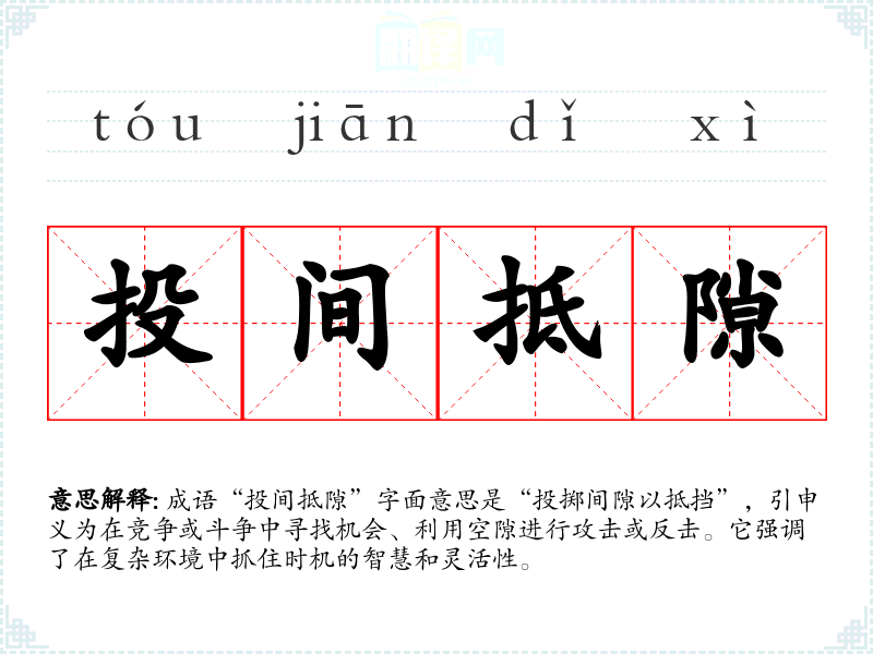 成语“投间抵隙”字面意思是“投掷间隙以抵挡”,引申义为在竞争或斗争中寻找机会、利用空隙进行攻击或反击。它强调了在复杂环境中抓住时机的智慧和灵活性。