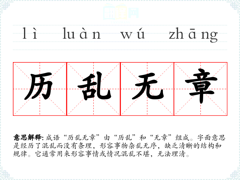 成语“历乱无章”由“历乱”和“无章”组成。字面意思是经历了混乱而没有条理,形容事物杂乱无序,缺乏清晰的结构和规律。它通常用来形容事情或情况混乱不堪,无法理清。