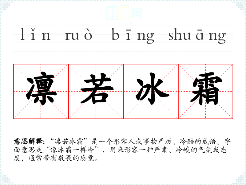 “凛若冰霜”是一个形容人或事物严厉、冷酷的成语。字面意思是“像冰霜一样冷”,用来形容一种严肃、冷峻的气氛或态度,通常带有敬畏的感觉。